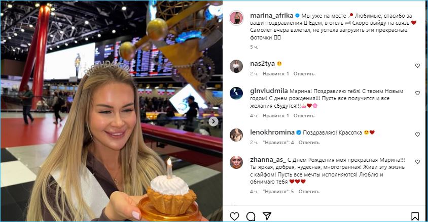 Отмечает свой 38 день рождения бывшая «священная корова Дома 2» Марина Африкантова, улетевшая его отмечать из столицы.