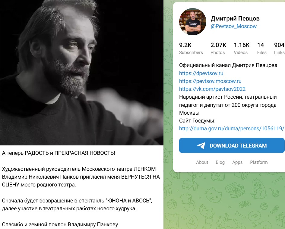 Как стало известно благодаря телеграм-каналу самого Дмитрия Певцова, нынешний художественный руководитель "Ленкома" предложил ему вернуться. "Художественный руководитель Московского театра ЛЕНКОМ Владимир Николаевич Панков пригласил меня ВЕРНУТЬСЯ НА СЦЕНУ моего родного театра. Спасибо и земной поклон Владимиру Панкову(орфография и пунктуация автора сохранены)", - поделился он радостной новостью со своими подписчиками. "Сначала будет возвращение в спектакль "ЮНОНА и АВОСЬ", далее участие в театральных работах нового худрука.", - добавил он.