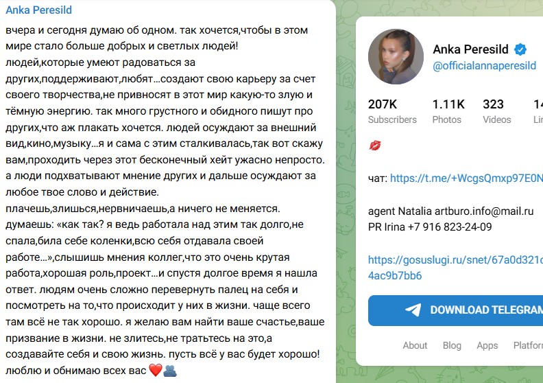 Анна призналась, ей горько наблюдать за осуждением проектов, в которых тот или иной человек выложился без остатка. Коллеги хвалят, поклонники тоже, но тут находится ряд личностей, переворачивающих всё с ног на голову. "плачешь,злишься,нервничаешь,а ничего не меняется. думаешь: «как так? я ведь работала над этим так долго,не спала,била себе коленки,всю себя отдавала своей работе…»,слышишь мнения коллег,что это очень крутая работа,хорошая роль,проект…", - сокрушается Пересильд. "так хочется,чтобы в этом мире стало больше добрых и светлых людей! людей,которые умеют радоваться за других,поддерживают,любят…создают свою карьеру за счет своего творчества,не привносят в этот мир какую-то злую и тёмную энергию.", - поделилась она своими эмоциями с подписчиками.