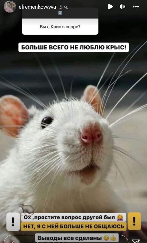 Негодует в социальных сетях Юлия Ефременкова, которая не ожидала удара в спину от своей проектной подруги. Ефременкова приревновала Мондезира и назвала Бухынбалтэ "крысой". Юле не понравилось поведение Кристины, которая не только записала для конкурса "Сейшельские каникулы" песню со Свет-Амуром, но и начала с ним флиртовать, прикрывая своё желание хайповать дружбой.