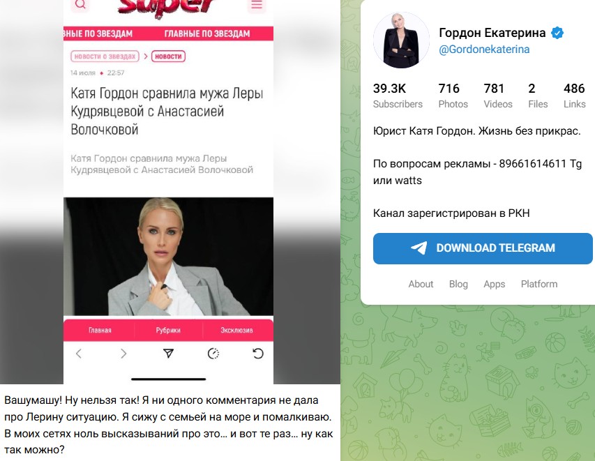 "Вашумашу! Ну нельзя так! Я ни одного комментария не дала про Лерину ситуацию. Я сижу с семьей на море и помалкиваю. В моих сетях ноль высказываний про это… и вот те раз… ну как так можно?", - отреагировала Екатерина. Таким образом, Гордон опровергла заявление, сделанное в адрес мужа Кудрявцевой.