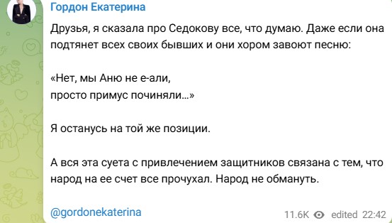 Гордон не смогла остаться в стороне от заявлений бывшего мужа, посвятив произошедшему отдельный пост в социальных сетях. "Друзья, я сказала про Седокову все, что думаю. Даже если она подтянет всех своих бывших и они хором завоют песню: «Нет, мы Аню не ..., просто примус починяли…» Я останусь на той же позиции. А вся эта суета с привлечением защитников связана с тем, что народ на ее счет все прочухал. Народ не обмануть(орфография и пунктуация автора сохранены)", - написала она на своей странице.
