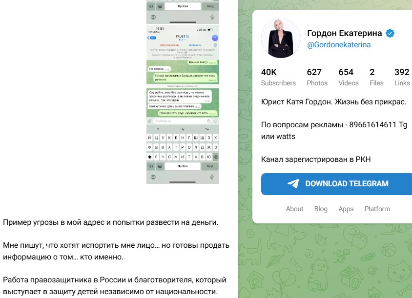 Звёздный юрист продемонстрировала перед подписчиками часть переписки с неким человеком, рассказавшим о нападении, готовящемся на неё.