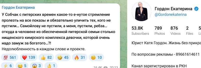 Позднее и Екатерина Гордон высказалась о реакции Собчак на случившееся с Оксаной Самойловой. "У Собчак с питерских времен какое-то е-нутое стремление пролезть на все показы и обязательно уличить тех, кого не пустили… Самойлову не пустили, а меня, пустили, ребза… откуда в человеке из обеспеченной питерской семьи столько нищенского кимрского комплекса девочки, которой очень надо замуж за богатого…?! Недолюбленность в каждом слове и проекте.", - отреагировала Екатерина на пост Ксении.