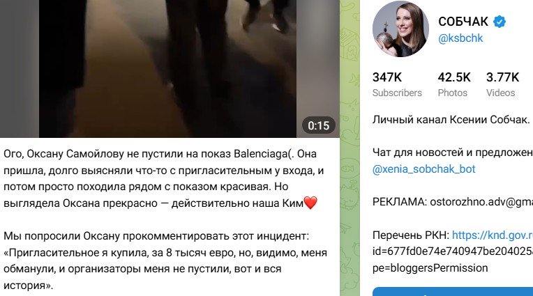 Как известно, Неделя моды в Париже привлекает большое количество известных миру шоу-бизнеса людей, включая и представителей российского. Ксения Собчак, известная законодательница моды, на регулярной основе появляется на главном событии года, то и дело комментируя события, происходящие на нём. На сей раз внимание телеведущей привлекла Оксана Самойлова, оплатившая билет на Неделю моды, но не попавшая туда. "Ого, Оксану Самойлову не пустили на показ Balenciaga(. Она пришла, долго выясняли что-то с пригласительным у входа, и потом просто походила рядом с показом красивая. Но выглядела Оксана прекрасно — действительно наша Ким❤️ Мы попросили Оксану прокомментировать этот инцидент: «Пригласительное я купила, за 8 тысяч евро, но, видимо, меня обманули, и организаторы меня не пустили, вот и вся история». Ну вот, кстати, так часто происходит, когда приглашают не сами бренды. Уже не первую историю такую слышу с купленными билетами. С другой стороны, есть и хорошие новости: бренды сейчас очень лояльно приглашают и русских клиентов и русских селебрити — и слава Богу!(орфография и пунктуация автора сейчас и далее сохранены)", - написала на своей странице Собчак.