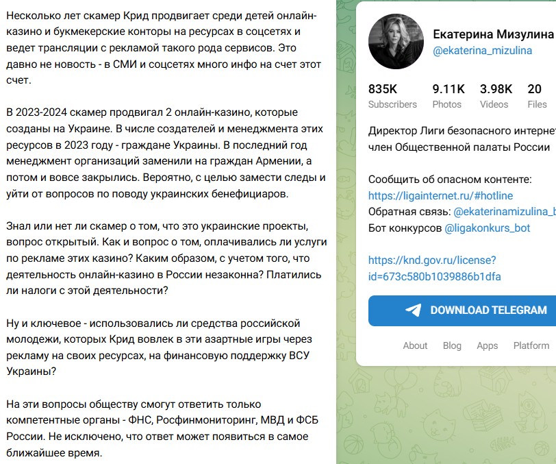 Мизулина отметила, всё то, что рекламировалось Егором, имело прямое отношение к украинским создателям и менеджерам. Ей интересно, платил ли Крид налоги с подобной противозаконной деятельности и шли ли вырученные средства на помощь ВСУ. "Ну и ключевое - использовались ли средства российской молодежи, которых Крид вовлек в эти азартные игры через рекламу на своих ресурсах, на финансовую поддержку ВСУ Украины? На эти вопросы обществу смогут ответить только компетентные органы - ФНС, Росфинмониторинг, МВД и ФСБ России. Не исключено, что ответ может появиться в самое ближайшее время(орфография и пунктуация автора сохранены)", - написала Екатерина на своей странице в социальных сетях.