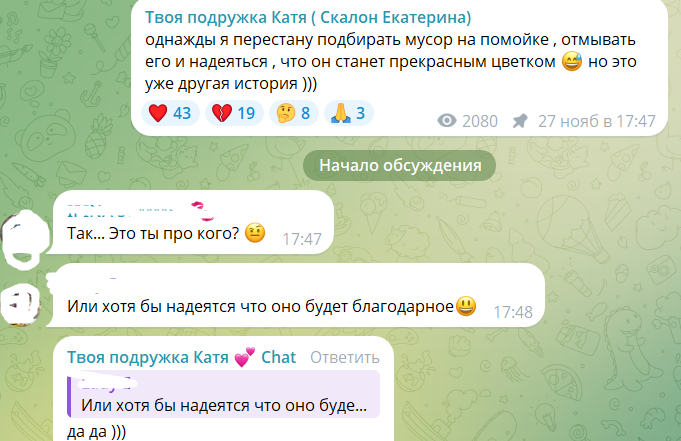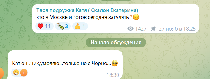 Среди своих подписчиц, живущих в Москве, Екатерина объявила сборы и захотела весело провести время. Одна из девушек откликнулась на предложение вместе погулять, а другая попросила блогершу не брать с собой на прогулку Александру Черно.