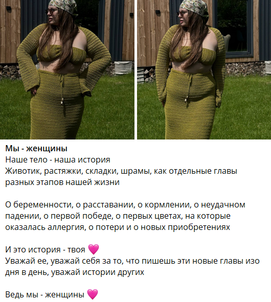 Шлома призывает подписчиц быть женственными и покупать её вещи. На днях Лена покрасила волосы в темный цвет и обнаружила, что некоторая одежда ей не подходит по цвету, некоторая стала просторной, потому что она похудела. Также выяснилось, что обувь и сумки у Елены есть лишние и она устраивает "гаражную распродажу".
