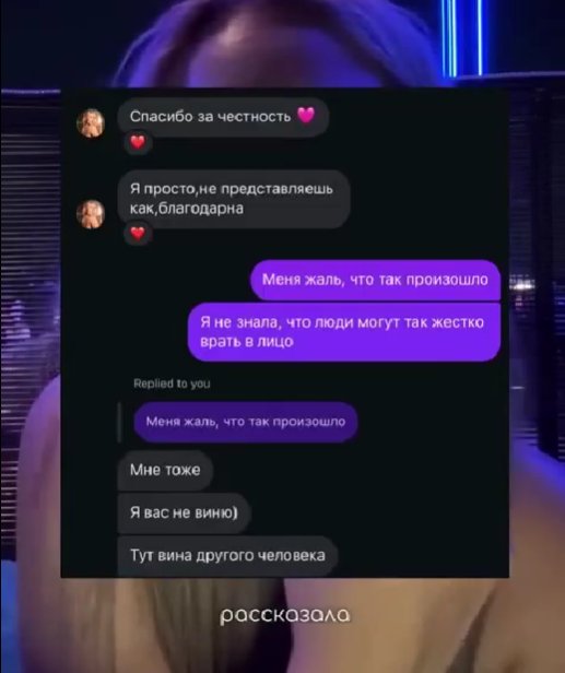 "Первый раз у меня опыт с настолько лживым человеком, который врёт в каждом своём слове. Он может смотреть долго, пристально в твои глаза и врать в каждом своём слове. По итогу, я оказалась виноватой в этой ситуации, потому что я выставила совместные сторис, не он, который лгал и мне, и ей, а я. Если бы я не сливала это в нельзяграм, никто бы не узнал и всё было бы у них в отношениях хорошо", - сообщила подруга Яббарова своим подписчикам. Также она показала переписку с Ильёй, который сам предлагал раскрутить ей страницу в нельзяграме, а потом обвинил её в хайпе.
