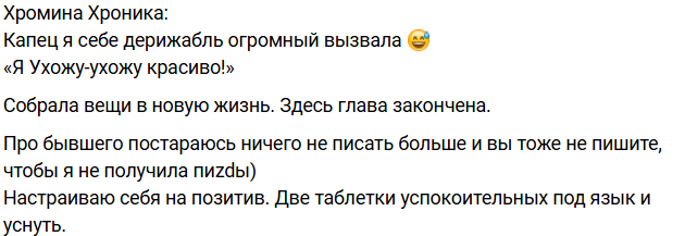 Пока подписчики переживали за судьбу Елены, она собирала вещи и удалила несколько постов про своего бывшего молодого человека. По словам Хроминой, и её вина есть в том, что в паре часто происходили ссоры, она работала над "бычкой" и эмоциональностью. Возможно, ей и сейчас нужно просто "выдохнуть", чтобы поговорить с мужчиной серьёзно, но не на повышенных тонах.