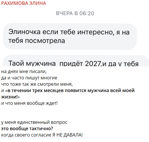Сначала Рахимовой нагадали, что мужчина появится через 3 месяца, сейчас появилась отсрочка - в 2027 году ей обещают счастливые отношения. А что делать до этого времени, ждать у окошка? Ранее мы рассказывали на шлоке про обман со стороны последнего поклонника Элины Степана. Может ли она вообще доверять мужчинам и почему её поклонницы так хотят поскорее выдать замуж Рахимову?