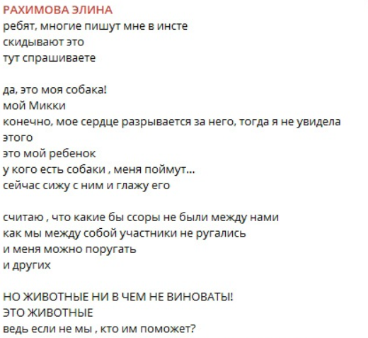 Во время противостояния с семьёй Салибековых перед конкурсом Элина Рахимова упустила важные детали, о которых ей напомнили зрители Дома 2. В вечернем эфире 01.08.2024 Элина на языке разбиралась с Тиграном, а её собака прыгала на Викторию Салибекову и сидела у неё на руках, в какой-то момент Элина начала говорить неприятные вещи про Тиграна, Виктория разозлилась и столкнула собаку с рук, что сразу же засняли операторы. Эфир можно посмотреть на шлоке в этом разделе.