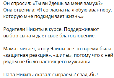 Вот это сюрприз от подруги получил Илья Яббаров - нож в спину, ведь он недавно начал договариваться о бюджете на свадьбу с Еленой Тепловодской, запросил 10 миллионов рублей, о чем мы рассказывали на шлоке, а Элина его опередила. Тепловодская такими темпами совсем без подруг останется.