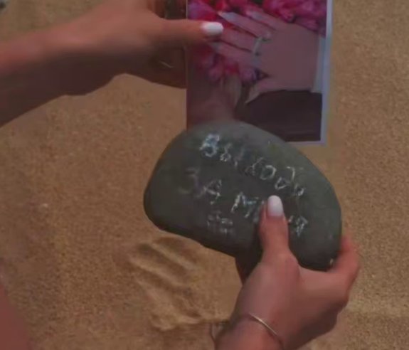 Оказывается, год назад в Сочи, на берегу Чёрного моря Никита сделал Элине предложение и подарил камень с надписью "Выходи за меня!". И этот камень, кто бы мог подумать, Рахимова сохранила (или нашла похожий), привезла в Китай и сегодня выбросила его в Южно-Китайское море возле Саньи, где расположена вилла участников Дома 2.Ни одна рыбка или краб не пострадали.