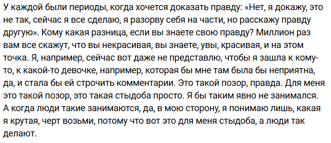 Участница телепроекта Дом 2 разрешила своим хейтерам писать негативные комментарии в её блоге. Элина Рахимова знает, что она красивая и крутая, пусть зрители проходятся по её внешности - её это не напрягает. Девушка записала для подписчиков несколько видео в телеграм-канале и призналась, что, кажется, взрослеет, критика её не задевает и не обижает, она держится и не замечает сказанных в её адрес плохих слов.