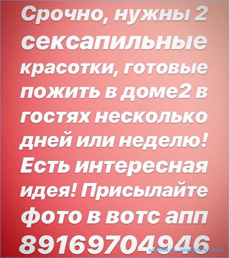 Ты красивая? Впервые в Москве? Негде переночевать? Есть замечательная бесплатная «гостиница», где можно весело провести время, познакомиться с настоящими звездами канала ТНТ, да еще и в телевизор попасть. Интересно? Звони кастинг директору самого скандального реалити-шоу России! Надежда Ермакова срочно разыскивает гостей для Дома 2!