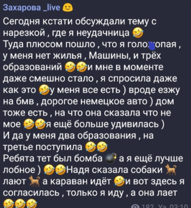 Захарова с критикой не согласилась. Машина у неё есть, квартиру собирается брать в ипотеку, есть дом, в котором живут её родственники, ведь она постоянно находится на реалити-шоу.