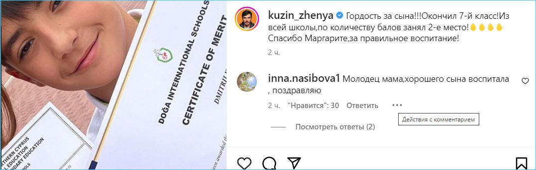 Как только Маргарита Агибалова-Марсо похвастала в социальных сетях, что первый ребенок телепроекта Дом 2 Митя закончил учебный год вторым в англоязычной школе, в которой он учится на Кипре, Женя тоже преисполнился отцовской гордостью.