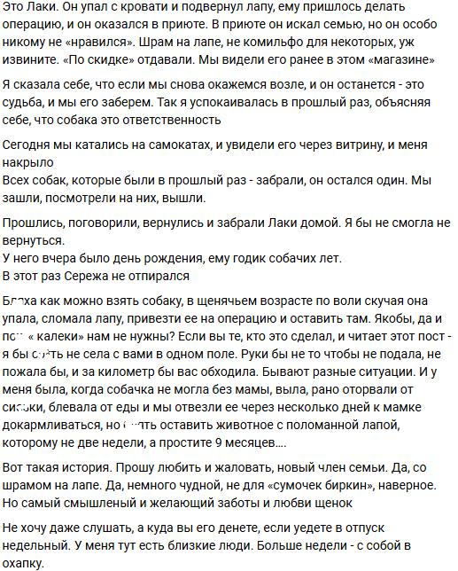 Евгения увидела собачку, которая была после операции, хозяин привез её к ветеринару лечить лапу и не забрал домой, хотя щенку было уже 9 месяцев. Дорожкина не смогла пройти мимо и подумала, что это её питомец, сама судьба их свела, а в будущем она найдет с кем его оставить, если придется путешествовать. Или будет брать с собой в дальние перелеты.