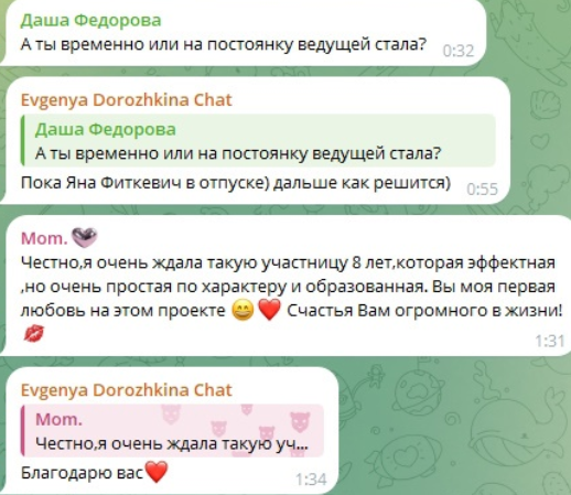 Женя Дорожкина рассказала подписчикам, что она побывала в роли ведущей и об этом открыто заявили на Лобном, чем она весьма гордится. Она вела теты и разговаривала с участниками, выслушивая их жалобы, и считает это интересным опытом и большой ответственностью. Дорожкину назначили временной ведущей Дома 2 в Сочи, пока Яна Фиткевич находится в отпуске.