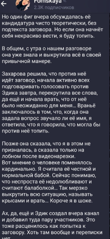 Яне Захаровой показалось, что Эдуард Берекчиев собирает против неё заговор и потому создал группу в социальных сетях для участников Дома 2, чтобы обсудить и договориться, как отправить Яну за ворота. Из-за этого на проекте произошел очередной скандал, в котором замешаны Алена Опенченко, Виктория Фомская и Захарова, причем Захарова сегодня намерена на мужском голосовании выгнать Эдика, чтобы Вика вслед за ним покинула проект.