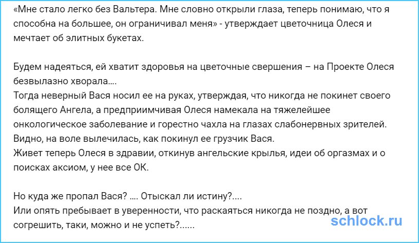 Друзья в тревоге, покинутая жена с малыми детьми в горести, Олеся Дзебисова, последняя любимая из всех многочисленных любимых похотливого Вальтера-Васи