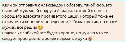 По крайней мере за судьбу собаки перестанут волноваться поклонники Колесникова, раз уж Гобозовы решили её пригреть? С Дмитренко, у которого опять перенесли суд с Ольгой Рапунцель, пока так не получается?