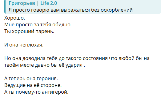 Манипуляции Григорьева усиливаются, как и слухи, что он может помириться с Квашниковой, когда навяжет ей чувство вины и заставит раскаиваться за мнимое предательство. В своём блоге Григорьев просит подписчиц не оскорблять Екатерину, но не удаляет неприятные для Кати комментарии. Похоже это на новый виток отношений пары на условиях, который устанавливает Григорьев?