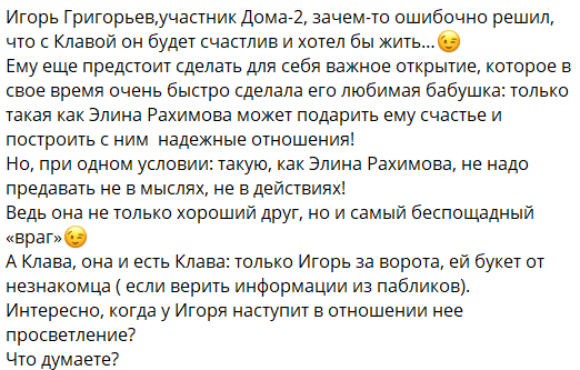 Психолог телепроекта Дом 2 Светлана Прель сделала свои выводы про отношения Клавдии Безверховой и Игоря Григорьева. Лучше бы Игорь прислушивался к бабушке, а не гнался за призрачным счастьем. Григорьев слишком наивен для Безверховой - считает Прель. И поэтому он сидит дома и мечтает о партнерстве и любви, а Клава уже вся в мыслях о походе в ночной клуб до утра.