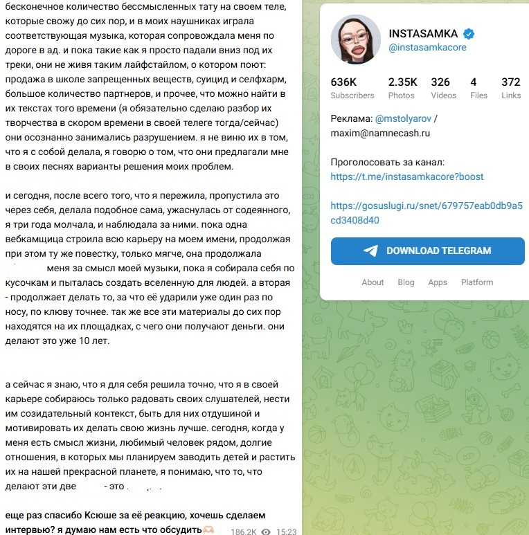 Позднее отметилась и сама Дарья, отметившая вклад Ксении в распространении её разоблачительного поста. Инстасамка поблагодарила Ксению Собчак за то, что та вывела имеющуюся информацию на новый уровень, тем самым подтолкнув её к дальнейшему рассмотрению нынешнего творчества Доры (Дарья Шиханова) и Мэйби Бэйби (Виктория Лысюк). "здравствуй Ксюша, я благодарю тебя за то, что ты вывела эту инфу на новый уровень. благодарю за то, что даешь мне возможность на такую серьезную аудиторию рассказать о себе и своих намерениях. согласна с тобой, мои старые треки 2019-2020- это та еще ..., и я сама тогда была не совсем в порядке. и кстати, я удалила эти альбомы и треки с площадок. это был очень сложный период моей жизни, в который я столкнулась с вещами намного хуже, чем написано в текстах. об этом чуть позже в этом же посте(орфография и пунктуация автора сейчас и далее сохранены)", - написала Инстасамка на своей странице в социальных сетях.