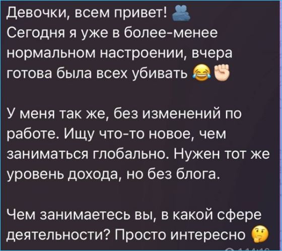 Придя в себя, Чернявская просит подписчиков помочь ей с поисками работы, которая приносила бы такой же доход, как и блог. И ищет менеджеров по своему продвижению в Телеграмм и Тик-Ток.