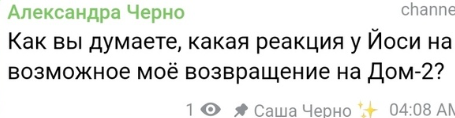 Александра Черно приняла участие в выборе предварительных симпатий и ведёт разговоры об официальном разводе, с печатью в паспорте. Саша требует, чтобы муж оставил её в покое, занимался своей жизнью и следил за ребёнком, а не позорил перед родственниками. Иосиф Оганесян в истерике из-за общения Черно с парнем из Дома 2. Иосиф требует прекратить его позорить, ему стыдно за поведение супруги, которая постоянно говорит про флирт с мужчинами.