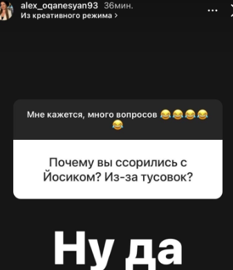 У Иосифа Оганесяна, по словам супруги, рыльце в пушку, просто Александра молчит и не хочет поливать его грязью. Возможно, речь идёт о последнем признании Иосифа, о которым мы писали на шлоке, или у Оганесяна тоже есть подруга на стороне? Ну теперь точно Оганесяны пожалуют на Лобное для выяснения отношений?
