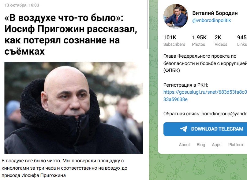 Как комментирует последнее заявление Иосифа Игоревича Бородин, воздух на момент интервью Пригожина был совершенно чист - вместе с кинологами они проверили каждый закоулок студии и воздух в том числе. Ничего подозрительного выявлено не было. От госпитализации бригадой "скорой помощи" продюсер отказался, досидев на интервью положенное время.