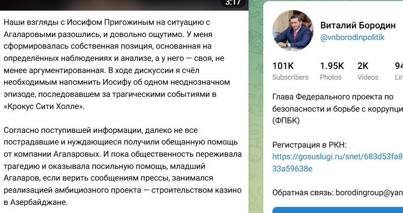 Как пояснил позднее Виталий Бородин, после интервью он проводил Иосифа Пригожина до машины, его лицо на тот момент ещё оставалось "зелёным". После случившегося продюсер чувствовал себя плохо ещё два дня, но уже сейчас полностью пришёл в себя.
