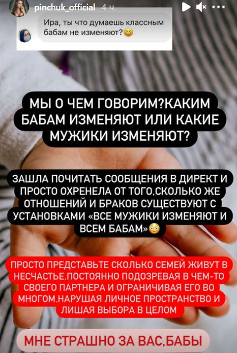 Ирина Пинчук уверена, что она "классная баба" и Чобанян не будет ей изменять и шокирована огромным количеством историй из жизни, которые присылают ей женщины. "Я просто в шоке, что столько семей живет с установкой, что все мужики изменяют, мне страшно за вас, бабы", - пишет Ира в своём блоге, подчеркивая, что она из тех девушек, которых легко потерять, но невозможно забыть. Тем более, что Арай дружит с Африкантовой и Кобелевой и к этим дамам Пинчук ревновать не собирается.