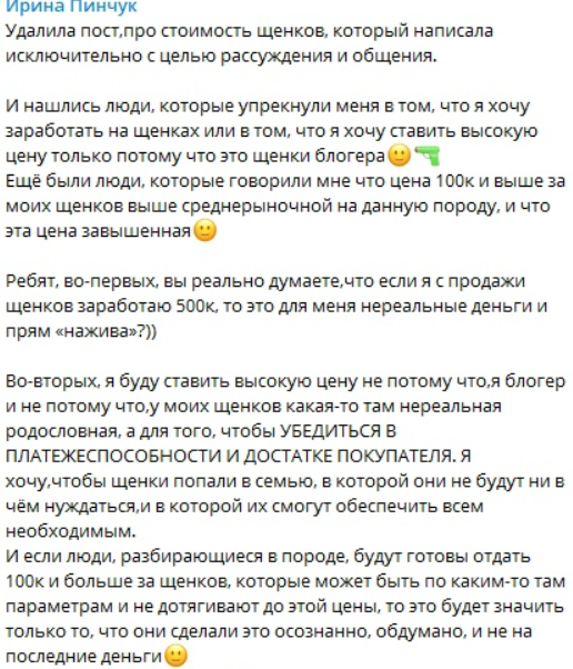 Ирина Пинчук хочет заработать на продаже щенков 500 тысяч рублей, но уверяет своих поклонников, что это не ради денег, для неё такая сумма вообще не "нажива". Главная цель жены Арая Чобаняна обеспечить комфорт малышам, Ирине нужно убедиться, что пушистиков покупают не на последние деньги по цене выше среднерыночной.