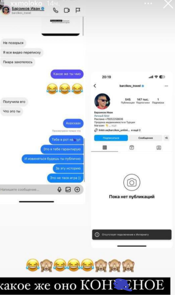 Иван Барзиков нажил неприятности из-за поездки в Сочи, его знакомая (или незнакомая) девушка угрожает ему своими связями из-за публичных оскорблений.