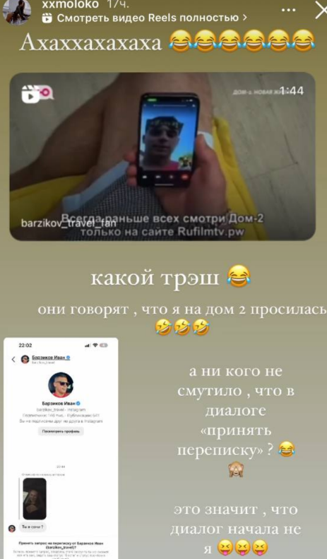 Девушка утверждает, что Барзиков первый ей написал, а она не захотела общаться, Ваня говорит, что начало переписки она удалила.