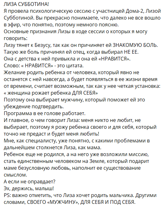 Елизавета Субботина готова стать матерью-одиночкой, если родит ребёнка от Лёши Безуса. Она заранее настроилась растить сына одна или просто вешает на уши лапшу психологу Дома 2? Светлана Прель считает, что из-за проблем с папой Лизу Субботину привлекает способность Безуса причинять боль. Светлана провела параллель между отношениями Лизы с Лёшей и её общением с отцом, который мало уделял времени маленькой Субботиной.