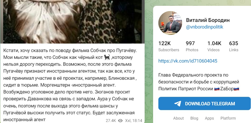 "Мои мысли такие, что Собчак как чёрный кот 🐈⬛ ,которому нельзя дорогу переходить. Возможно, после этого фильма Пугачёву признают иностранным агентом, так как все, кто у неё принимал участие в её проектах, например, Блиновская , сидит в тюрьме., - добавляет глава Федерального проекта по безопасности и борьбе с коррупцией, - Моргенштерн -иностранный агент. Возбуждено уголовное дело против него. Зюганов просит проверить Даванкова на связь с западом. Аура у Собчак не очень, поэтому после выхода этого фильма шансы у Пугачёвой высоки получить этот статус. Будет заслуженная иностранный агент".