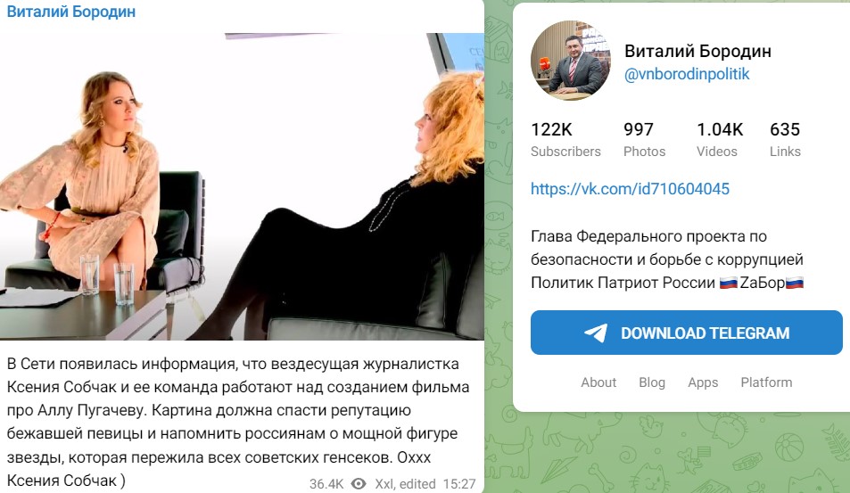 Как стало известно благодаря изданию 7days.ru, в Сети появились новости о съёмках фильма об Алле Пугачёвой, которые поторопился прокомментировать один из депутатов ГД. Виталий Бородин не уверен, что фильм об Алле Борисовне произведёт на кого-либо особое впечатление, скорее наоборот - привлечёт лишнее внимание представителей Министерства Юстиции. "В Сети появилась информация, что вездесущая журналистка Ксения Собчак и ее команда работают над созданием фильма про Аллу Пугачеву. Картина должна спасти репутацию бежавшей певицы и напомнить россиянам о мощной фигуре звезды, которая пережила всех советских генсеков. Оххх Ксения Собчак )", - написал он на своей странице в социальных сетях.