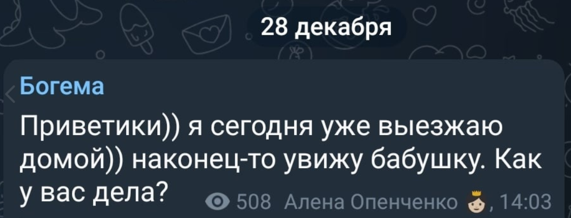 Алёна Опенченко собрала вещи и подарки и уезжает к бабушке в деревню, пожилая женщина чувствует себя плохо, поэтому Опенченко хочет новогодние каникулы провести с ней рядом. Но своего парня в деревню Алёна с собой не берёт, Никита не может с ней поехать в ту обстановку, которая царит дома у Алёны. То ли ей стыдно везти Никиту в разруху, то ли он будет лишним, но по словам участницы Дома 2, бабушка на данный момент не готова принимать гостей.