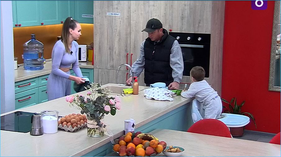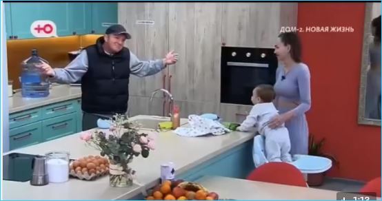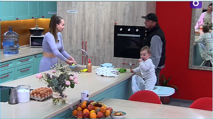 На кухне в это время находилась Виктория Салибекова с сыном Леоном, оставленным стоящим на стульчике для кормления, и внимательно наблюдающим за спорящими взрослыми. Еще и с ложкой во рту, что вполне устраивало его маму, участвующую в общем сюжете.