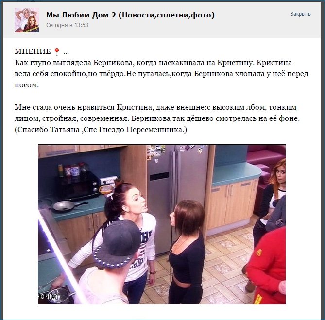 Как глупо выглядела Берникова, когда наскакивала на Кристину. Кристина вела себя спокойно,но твёрдо.Не пугалась,когда Берникова хлопала у неё перед носом.