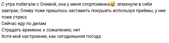 Приговаривая, что жаль потраченного времени и тяжело уходить с любовью, Катя переехала и живет с собакой Оливкой, за которую она поблагодарила Игоря - питомец был подарком ей на день рождения. Квартира, на которой остался Игорь, находится неподалеку от Поляны, что Катю не устраивает, ей понравился другой район Москвы, ближе к центру.