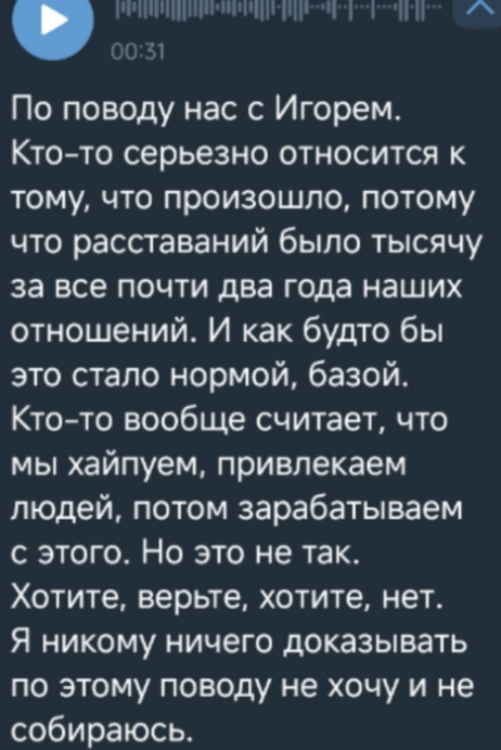 По словам Квашниковой, она провела тщательный анализ своих отношений и поняла, что они с Игорем разные люди. То, что он допускает в отношениях, для неё неприемлемо.