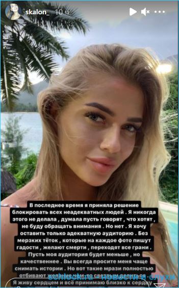 Вот и до Екатерины Скалон докатилась война хейта. Бывшая участница телепроекта дом 2 решила провести эксперимент - ненакрашенная, в старой одежде, она ходила по торговому центру и просила продавцов показывать ей дорогой товар - косметику и фены. Общались с ней неохотно, из чего Катя сделала вывод, что к клиенткам, которые хорошо выглядят, у продавцов другой подход. Её сторис не понравились некоторым фолловерам и теперь Скалон избавляется от неадекватных подписчиков.