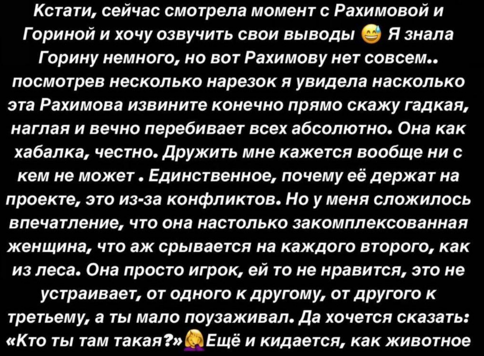 Таня, по первому впечатлению, подумала, что Рахимова сбежала из леса, бросается на людей и, в целом, закомплексованная женщина. Хотя комплексов у Элины нет, как мы уже писали на шлоке, Эля умеет за себя постоять и не боится спорить с топчиками, которые сами разговаривают на повышенных тонах, а то и попросту кричат, как Илья Яббаров и переорать его невозможно. Кричи, чтобы тебя услышали на Доме 2. Что тут удивляться, понятно же, с кого Рахимова берёт пример? Согласны с мнением Тани Репиной?