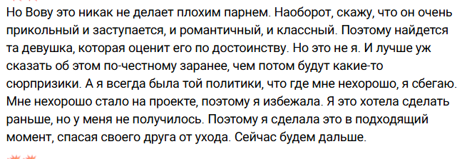 Так и запишем: наигралась в любовь с мужчинами, разочаровалась, испугалась шума и разборок из-за Балана и ушла. Как считаете, ушла бы Ермакович, если бы отношения строила не с Вовой, а с Никитой Гурандой?